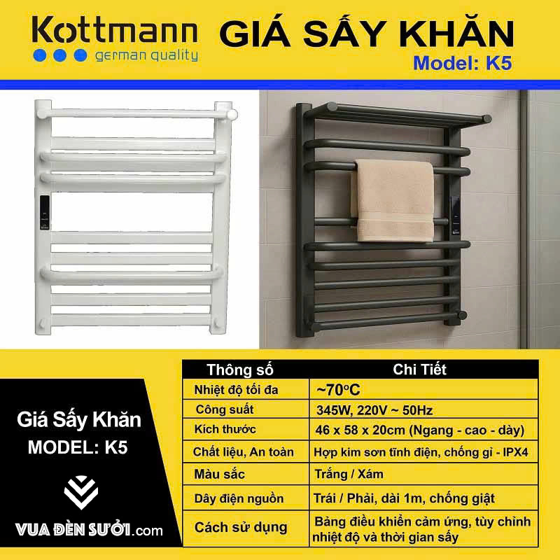 Với khả năng làm nóng nhanh, giá sấy khăn Kottmann có thể đạt tới nhiệt độ tối đa lên đến 70°C – mức nhiệt lý tưởng để: