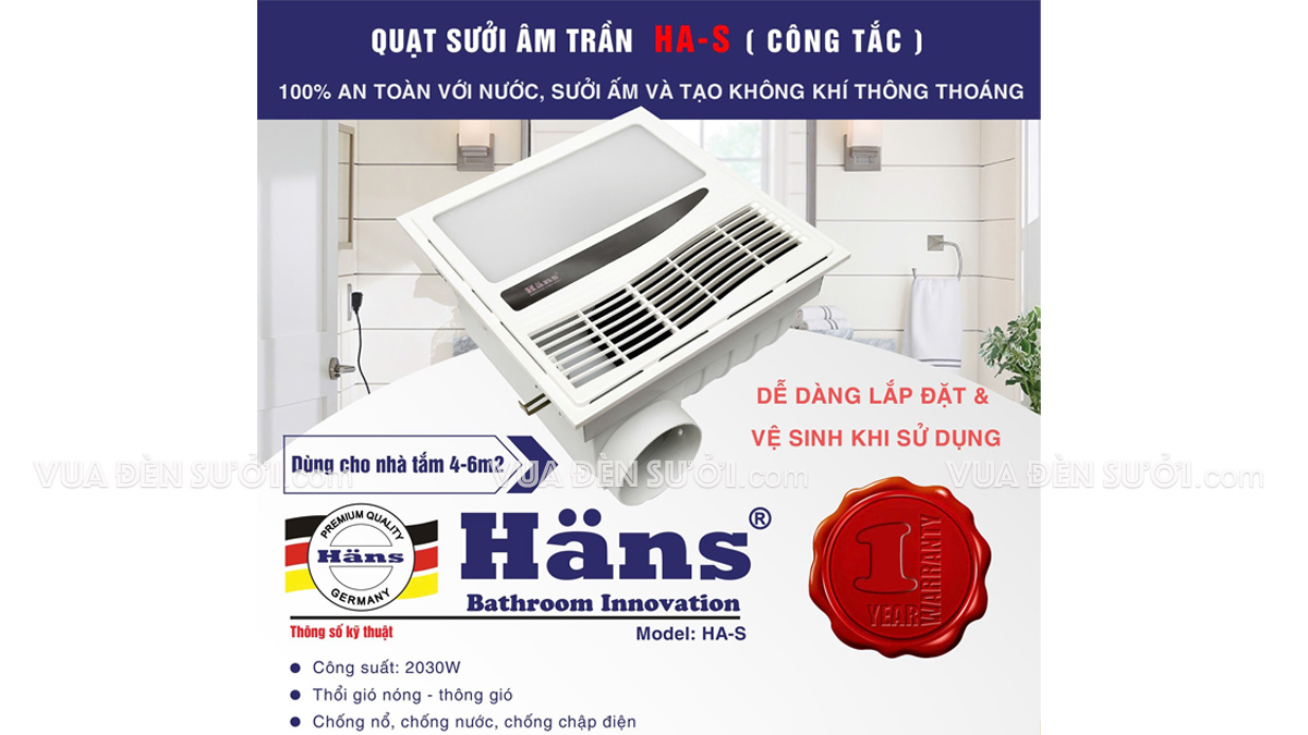 Đèn sưởi nhà tắm Häns là thương hiệu tiên phong tại thị trường Việt Nam, được người tiêu dùng đánh giá cao và tin dùng suốt nhiều năm. Trong đó dòng sản phẩm đột phá quạt thông gió âm trần tích hợp sưởi ấm, điều khiển bằng công tắc HA-S. Sản phẩm có mức giá vô cùng cạnh tranh, là giải pháp tối ưu cho mọi gia đình Việt